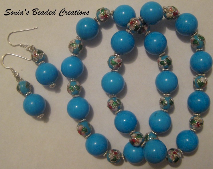 82 - Blue glass and beautiful cloisonne beads with sterling silver accents. (2 Elastic Bracelets - Length 7" and Earrings)