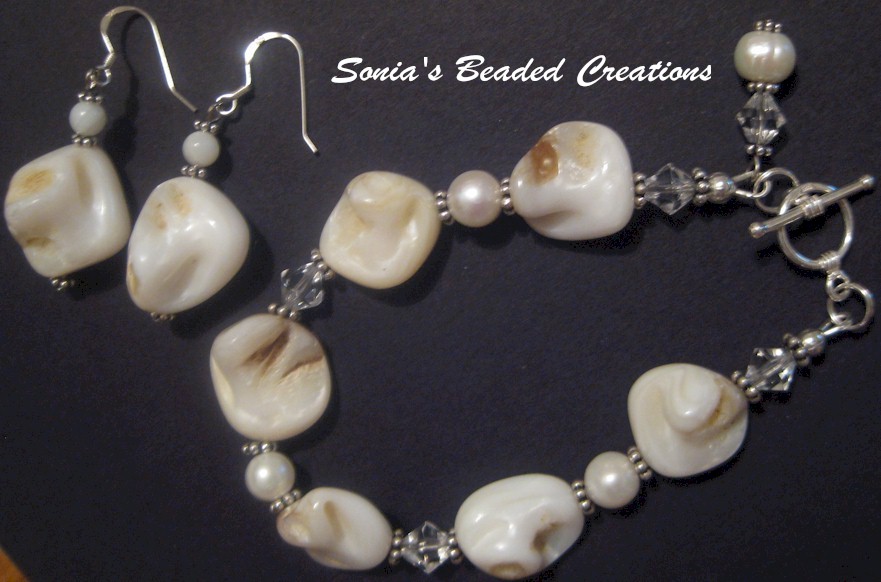 74 - Shell beads and stones with sterling silver accents. (Bracelet - Length 8" and Earrings)