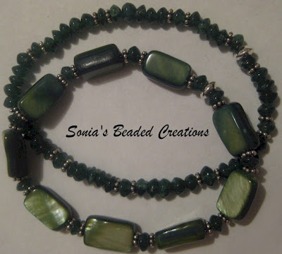 92 - Green shell and stone beads with sterling silver accents. (2 Elastic Bracelets - Length 7")