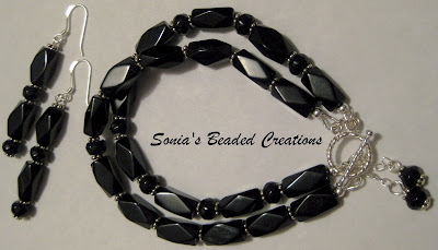 94 - SOLD - Black glass beads with sterling silver accents. (Bracelet - Length 8" - and Earrings)