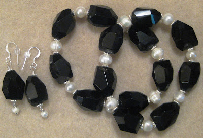 SOLD - 156 - Black Glass and Pearls with Sterling Silver Accents. (2 Elastic Bracelets and Earrings)